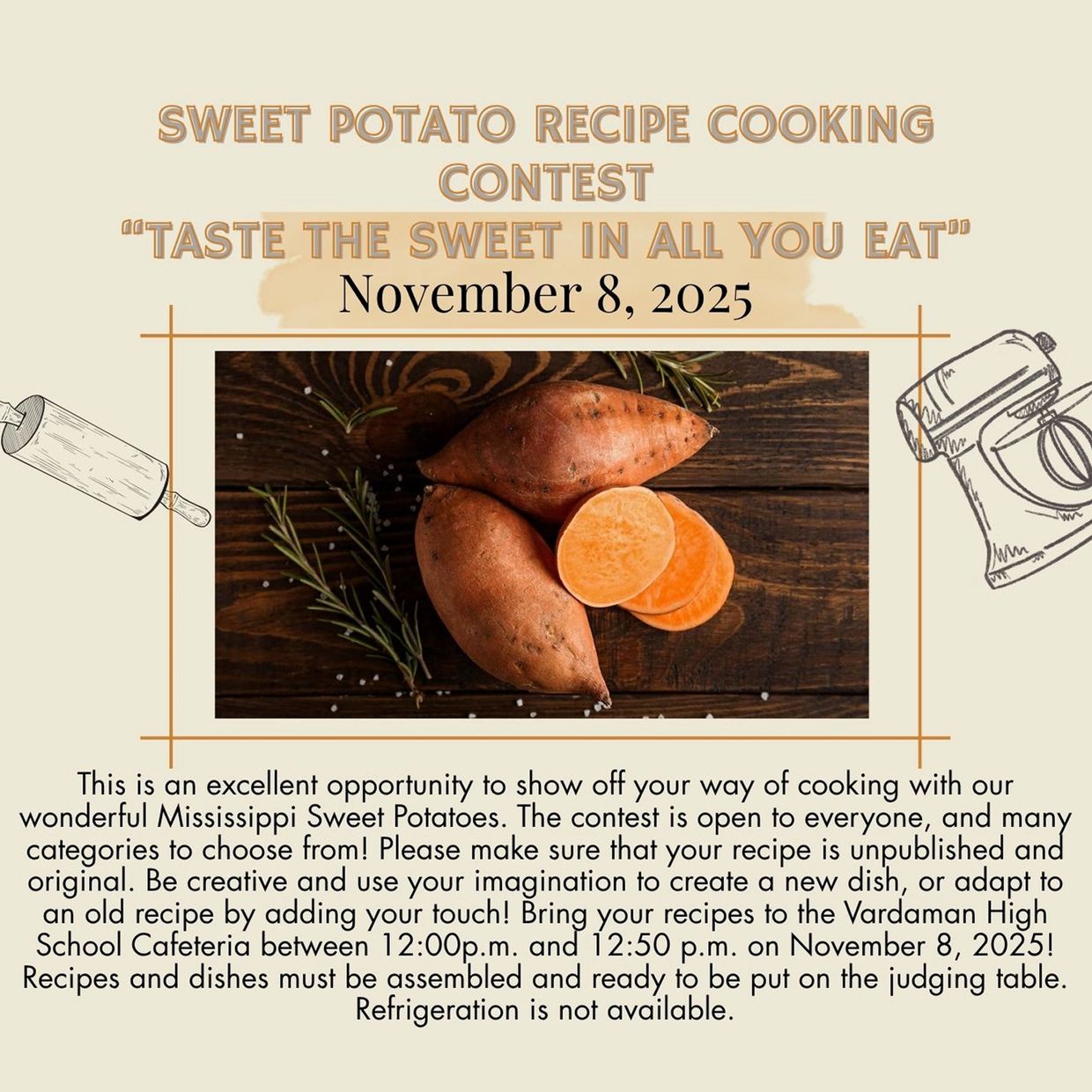 No application is needed. However, when you turn in your dish, you must bring a recipe written without a name. All entries must be brought to the Vardaman High School Cafeteria between 12:00 p.m. and 12:50 p.m. on Saturday, November 8th. Judging will begin at 1:00 p.m. Winners will be announced at the Harvest Banquet.